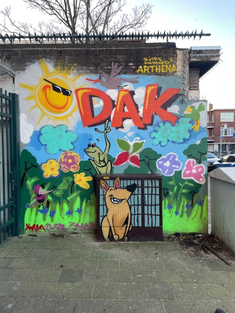 -Kleurkunst in je Wijk! Grauwe muur en elektriciteitshuisje in de wijk Laak bij de DAK opvang.