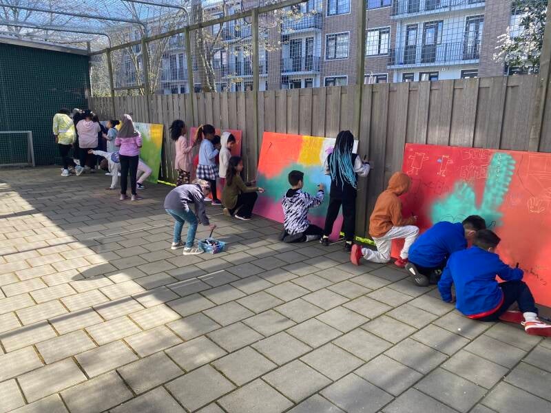 -Kleurkunst in je wijk! Graffiti op panelen op de schoolmuur van de school en door de kinderen van de Dr. Willem Dreesschool uit Laak.